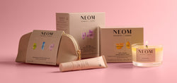 NEOM skincare products including a candle, hand balm, and packaging on a white background NEOM candle, hand balm, and packaging on a dark background